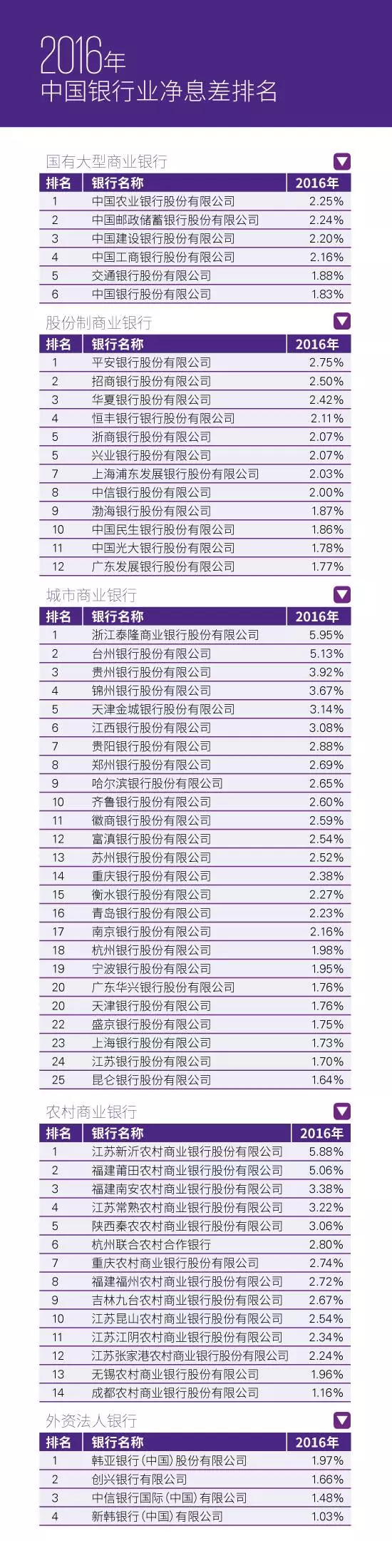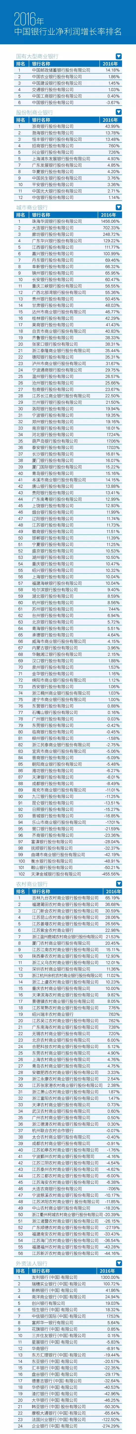畢馬威于2017年7月27日發(fā)布了《2017年中國(guó)銀行業(yè)調(diào)查報(bào)告》,本文按國(guó)有大型商業(yè)銀行、股份制商業(yè)銀行、城市商業(yè)銀行、農(nóng)村商業(yè)銀行和外資法人銀行分類,對(duì)《2017年中國(guó)銀行業(yè)調(diào)查報(bào)告》中展示的200家銀行2016年的凈利潤(rùn)增長(zhǎng)率和凈息差兩大盈利能力指標(biāo)進(jìn)行了排名。